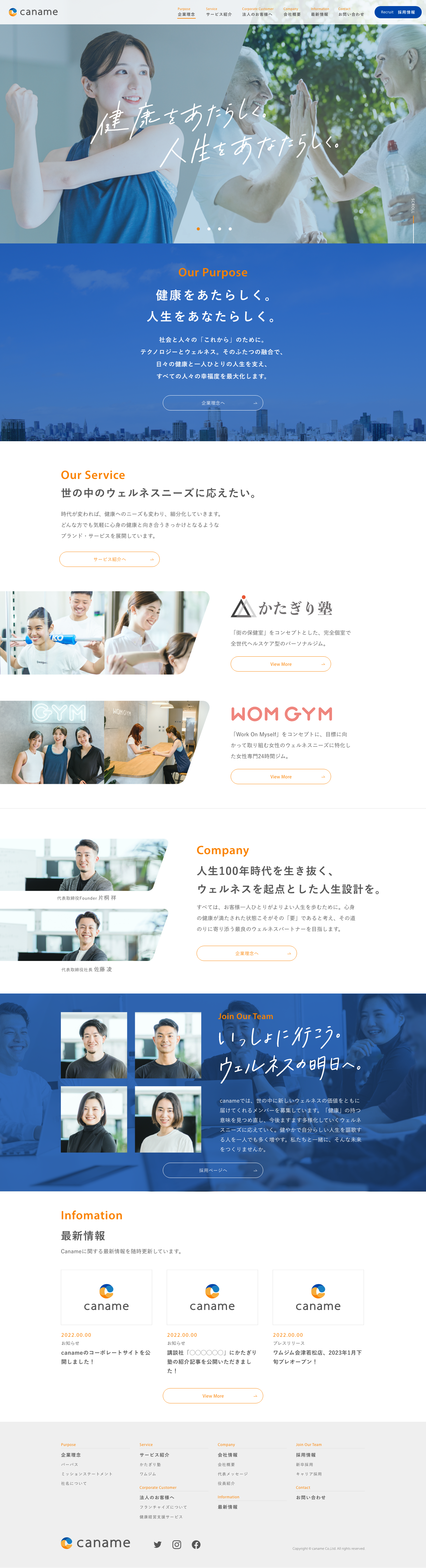 「かたぎり塾」や「WOMGYM」を経営するウェルネス企業「caname株式会社」のコーポレートブランディング。会社名、ロゴマーク、パーパス、ミッションの策定、コーポレートサイト制作を担当いたしました。